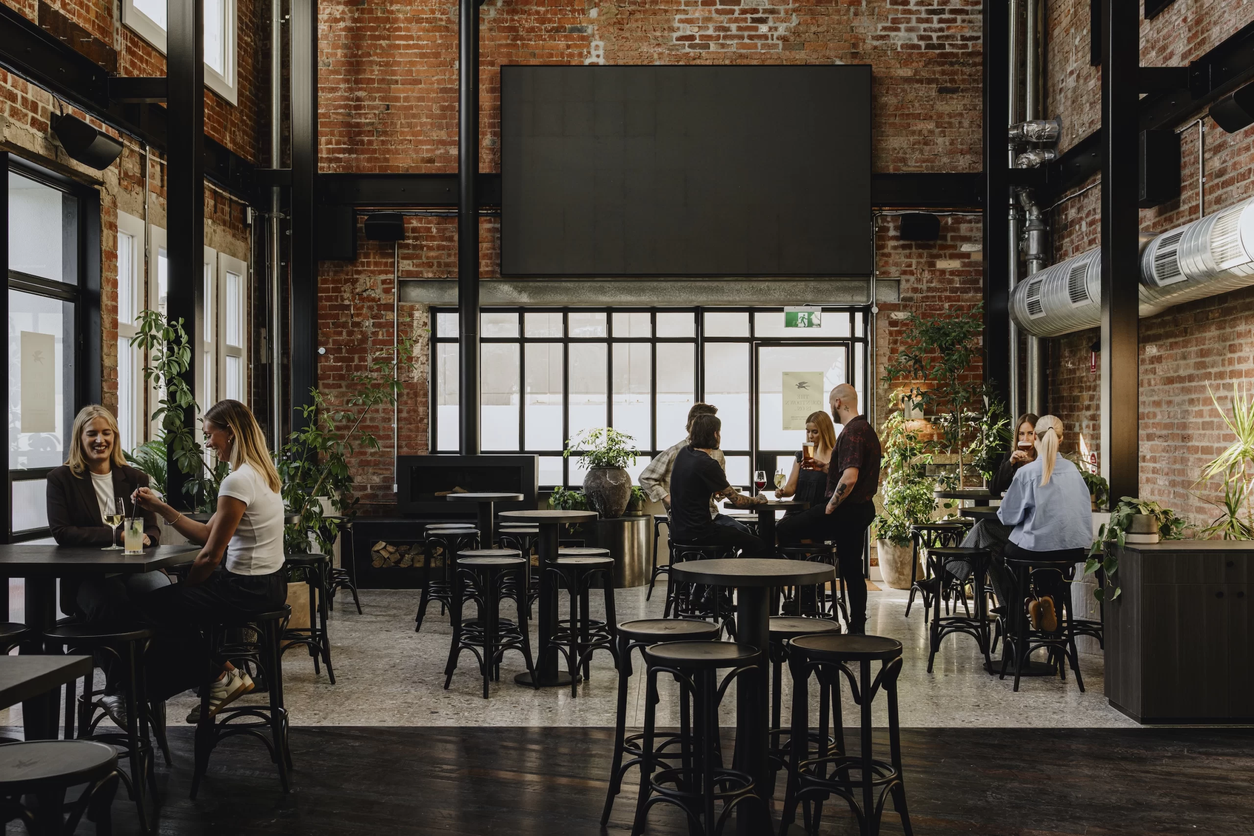 A double-height atrium connects the ground floor visually to the upper levels. Recycled timber flooring and restored windows reference earlier design periods. Meanwhile, a 165-inch screen in the beer garden supports live sports viewing.